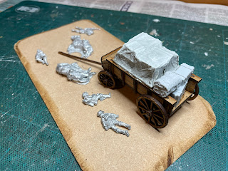 A quick progress update on the ambushed supply wagon terrain-piece: I have cut an MDF base using my scroll saw and chamfered the edges with an angle grinder (kids, check with your Mum before attempting to use!). Here's the latest stage, with the miniatures glued to the base and the wagon loaded with supplies.
